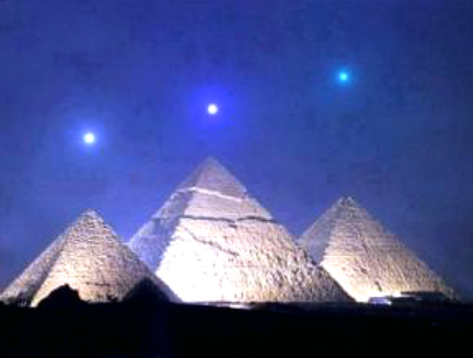 On dit que le 3 décembre 2012 les trois planètes de la photo, Mercure, Vénus, Saturne, se sont ainsi alignées au-dessus des 3 pyramides de Gizeh.